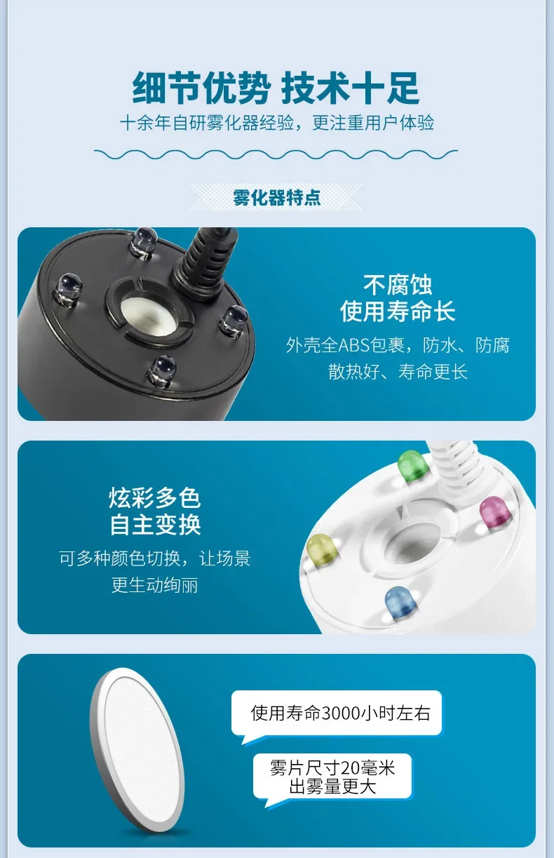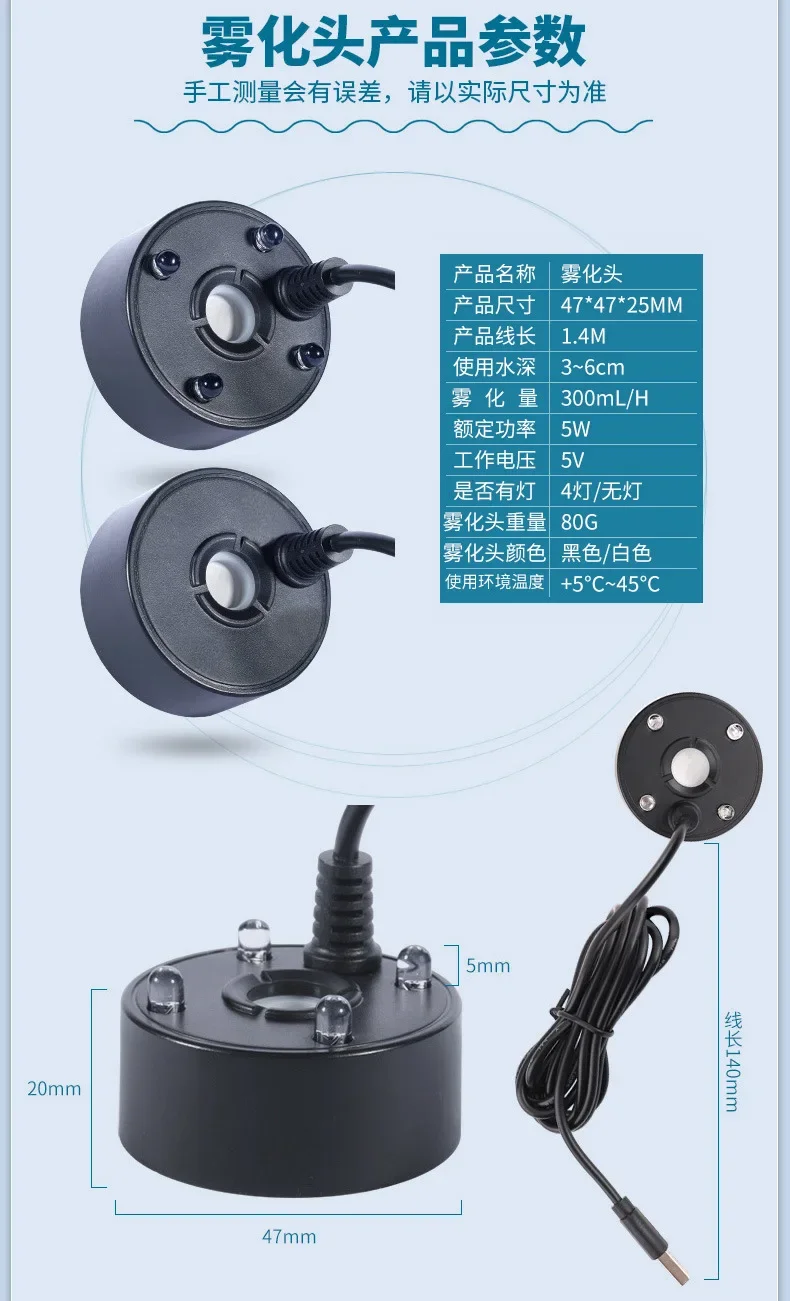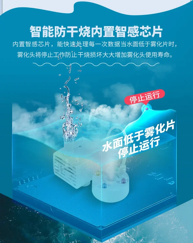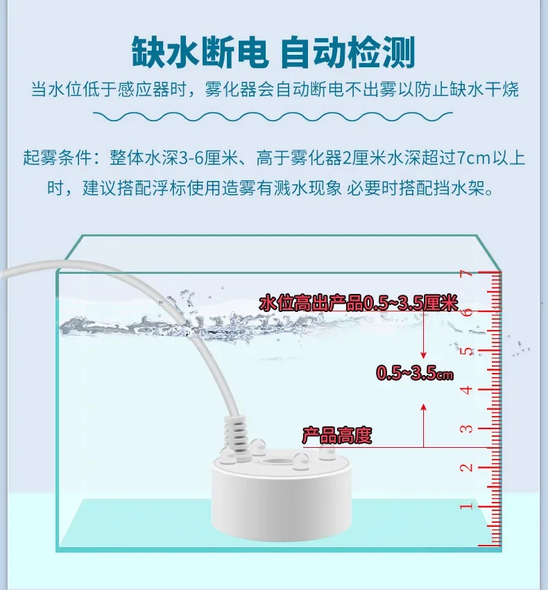 The water surface should be within 2 centimeters above the atomizer water level sensor, and the water depth should be kept at 7 centimeters. The atomization effect is suitable, but if the water is too deep, a buoy should be equipped;