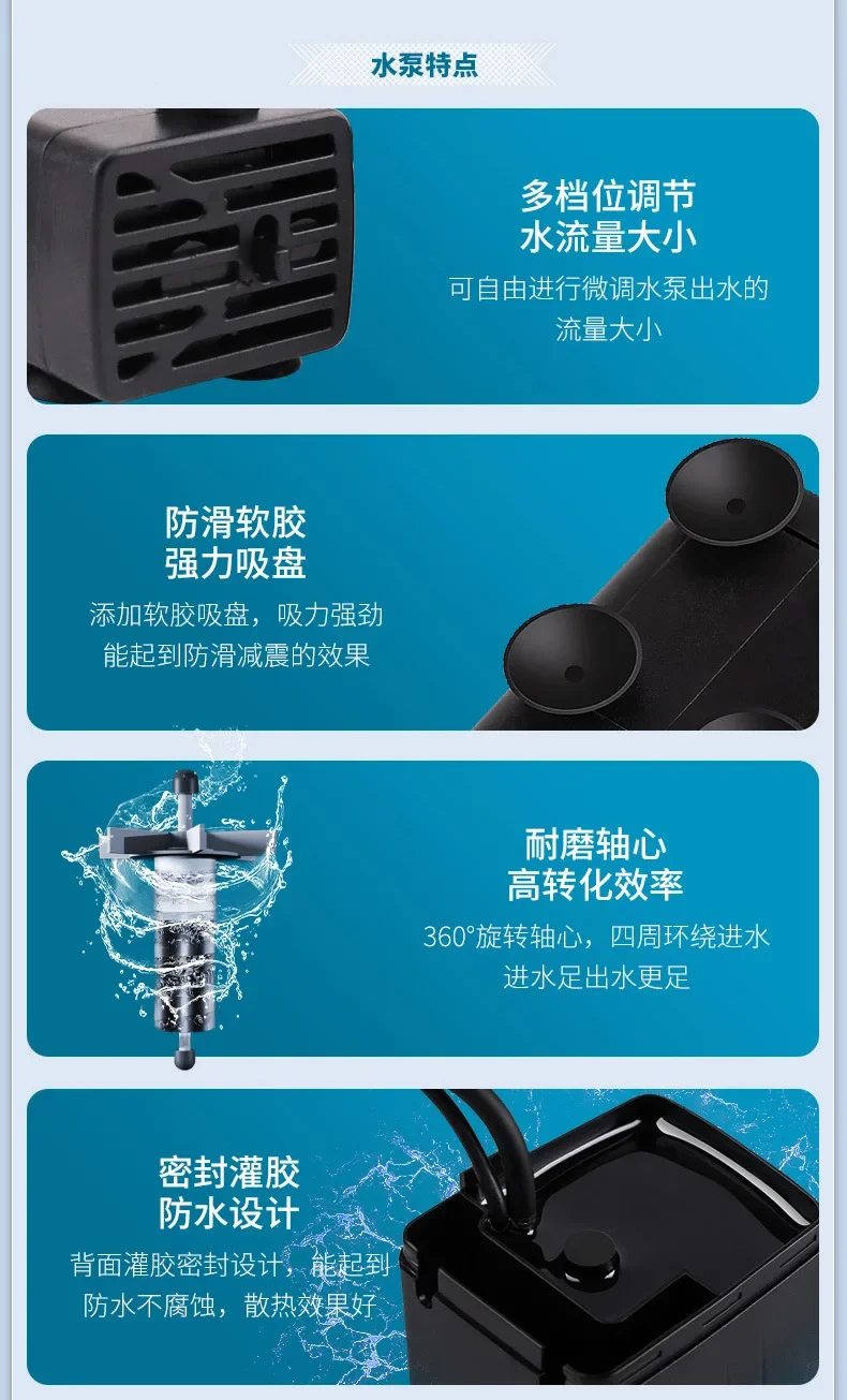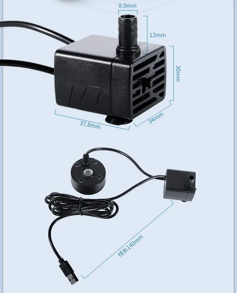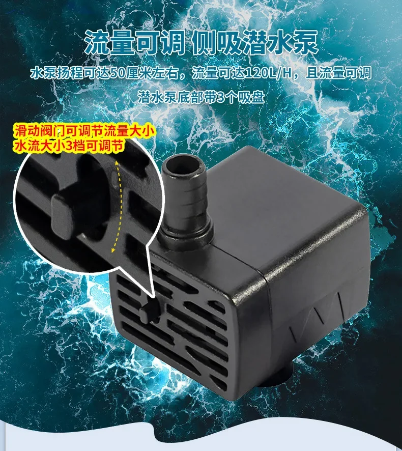 1. The water pump is a submersible pump that must be completely immersed in the water and then plugged in to circulate water;